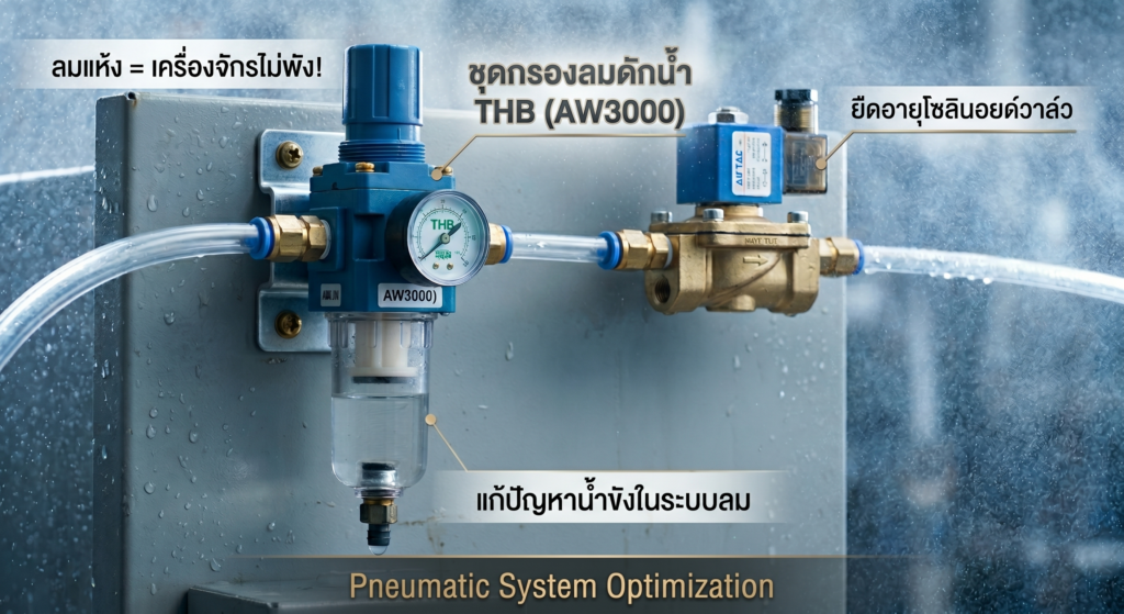 ลมไม่แห้ง เครื่องจักรพัง คือ น้ำที่แฝงตัวมากับอากาศอัด คือศัตรูตัวฉกาจที่ทำลายระบบลมและเครื่องจักรของคุณ การติดตั้งชุดกรองลมดักน้ำ THB (AW3000) ก่อนเข้าเครื่องจักร เป็นการลงทุนที่คุ้มค่า เพื่อยืดอายุการใช้งานของโซลินอยด์วาล์วและเครื่องจักรของคุณ และช่วยให้ระบบลมของคุณทำงานได้อย่างมีประสิทธิภาพและยาวนาน อย่าปล่อยให้ “ลมไม่แห้ง” ทำลายเครื่องจักรของคุณอีกต่อไป!