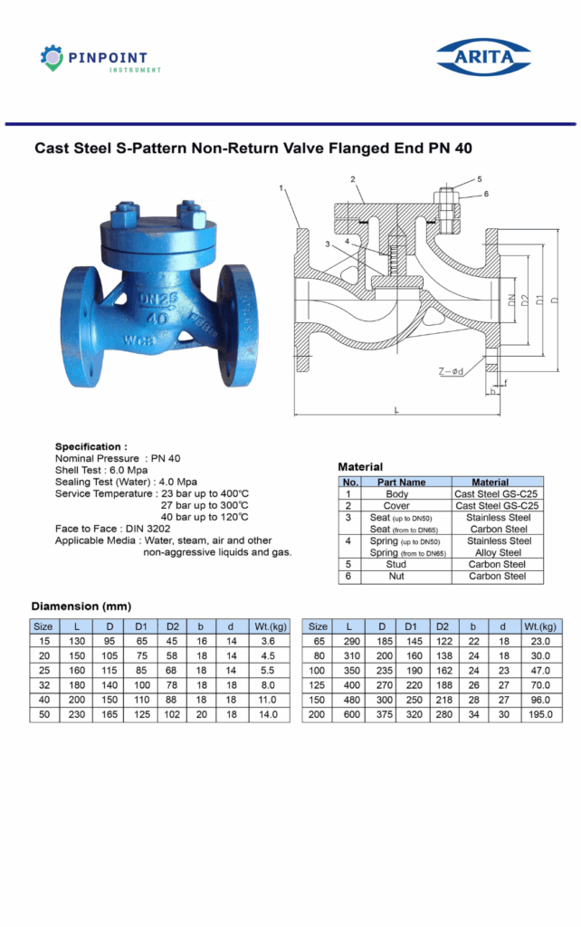 Arita Check Valve S-Pattern วาล์วกันกลับเหล็กหล่อ Cast Steel S-Pattern Check Valve PN40 DN25 ออกแบบเพื่อป้องกันการไหลย้อนกลับของของไหล เหมาะสำหรับงานอุตสาหกรรม ระบบท่อแรงดันสูง น้ำมัน ก๊าซ และไอน้ำ ผลิตจากวัสดุ WCB แข็งแรง ทนทานต่อแรงดันและอุณหภูมิสูง
