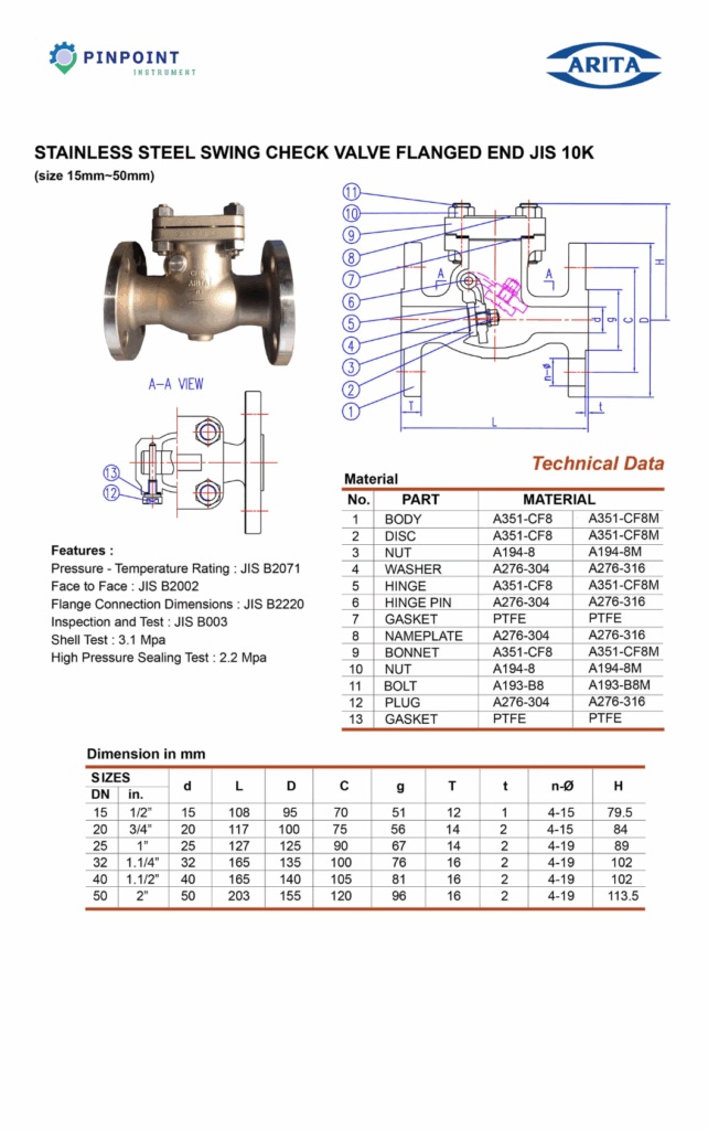 ARITA Swing Check Valve Arita ผลิตจากสแตนเลสเกรด 316 คุณภาพสูง ใช้สำหรับป้องกันการไหลย้อนกลับของของเหลวภายในระบบท่อ โดยมีแผ่นบานพับภายในที่เปิดปิดอัตโนมัติตามทิศทางการไหล เชื่อมต่อแบบ หน้าแปลน (Flange) แข็งแรง เหมาะสำหรับระบบน้ำ, น้ำมัน, ไอน้ำ และสารเคมีหลากหลายประเภท