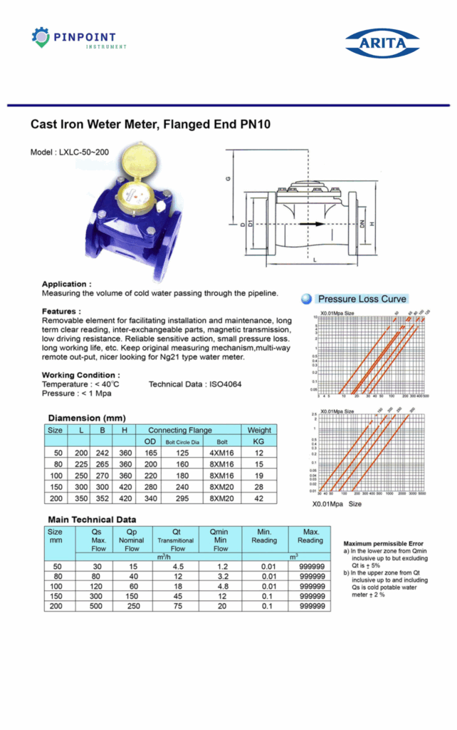 เครื่องวัดน้ำแบบหน้าแปลนรุ่น PN10 คืออุปกรณ์วัดปริมาณการไหลของน้ำที่ได้รับความนิยมอย่างแพร่หลายในกลุ่มอุตสาหกรรมและอาคารขนาดใหญ่ ตัวเรือนผลิตจากวัสดุเหล็กหล่อแข็งแรง มีความทนทานสูงต่อความดันและความร้อน สามารถใช้งานได้ยาวนานแม้ในสภาวะแวดล้อมที่ต้องใช้งานหนัก พร้อมฝาครอบมาตรวัดแบบเปิด-ปิด เพื่อเพิ่มความสะดวกในการอ่านค่าหน้างาน