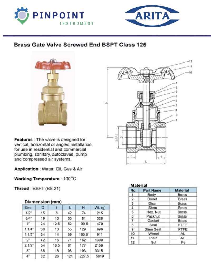 Arita Gate Valve (วาล์วประตูน้ำทองเหลือง) เป็นวาล์วที่ใช้สำหรับการเปิด–ปิดการไหลของของเหลวในท่อ โดยอาศัยการเลื่อนของแผ่นวาล์ว (Gate) ขึ้น–ลง เหมาะสำหรับระบบที่ต้องการเปิดเต็มที่หรือปิดสนิท ไม่เน้นการปรับปริมาณการไหล