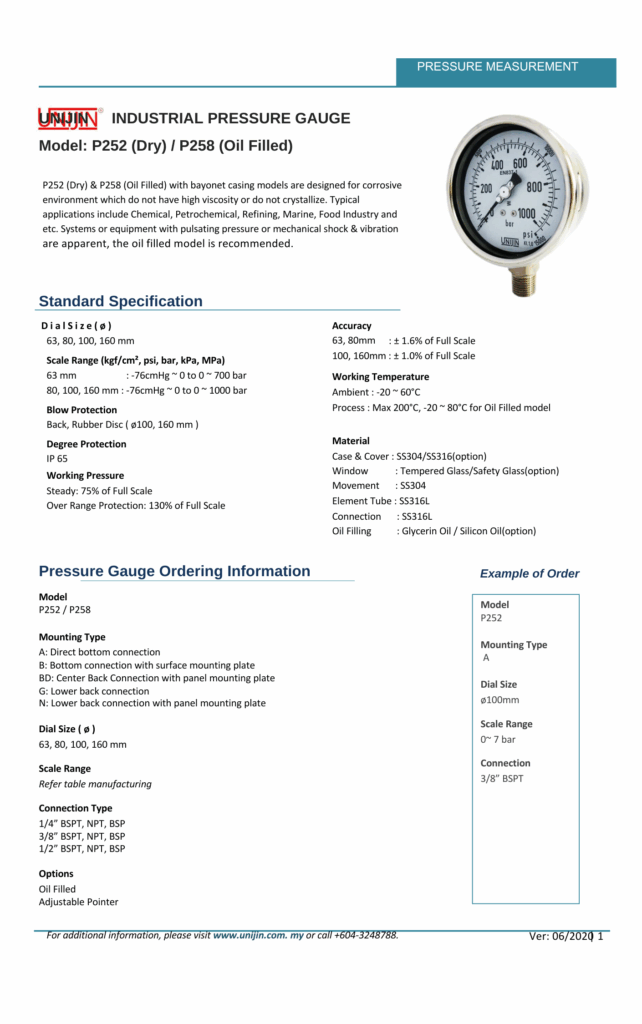 Pressure Gauge UNIJIN รุ่น P252/258 คือเกจวัดแรงดันคุณภาพสูงที่ออกแบบมาเพื่อรองรับงานที่ต้องการแรงดันสูงเป็นพิเศษ เช่น โรงงานอุตสาหกรรม, ระบบไฮดรอลิก, ปิโตรเคมี, เครื่องจักรกลหนัก และงานที่มีแรงดันสูงสุดถึง 1000 bar
