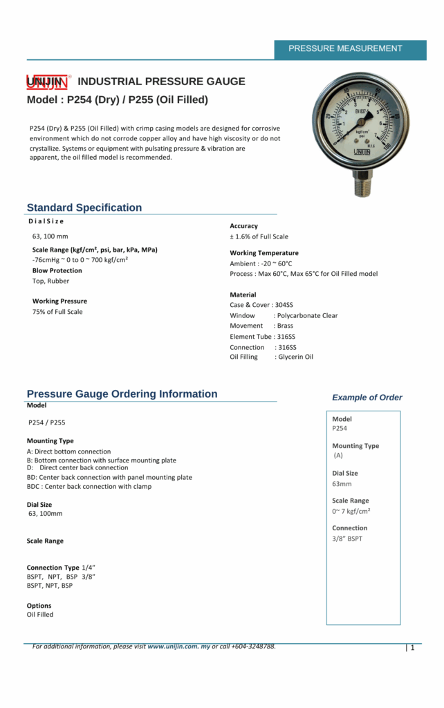 สั่งซื้อ Pressure Gauge UNIJIN P254 ได้ที่ Pinpoint Instrument โทร 089-612-8998”