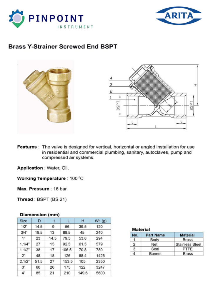 #BrassYStrainer #YStrainer #ARITA #วาล์วกรองทองเหลือง #BSPT #ตะแกรงสแตนเลส #ระบบท่อ #PinpointInstrument